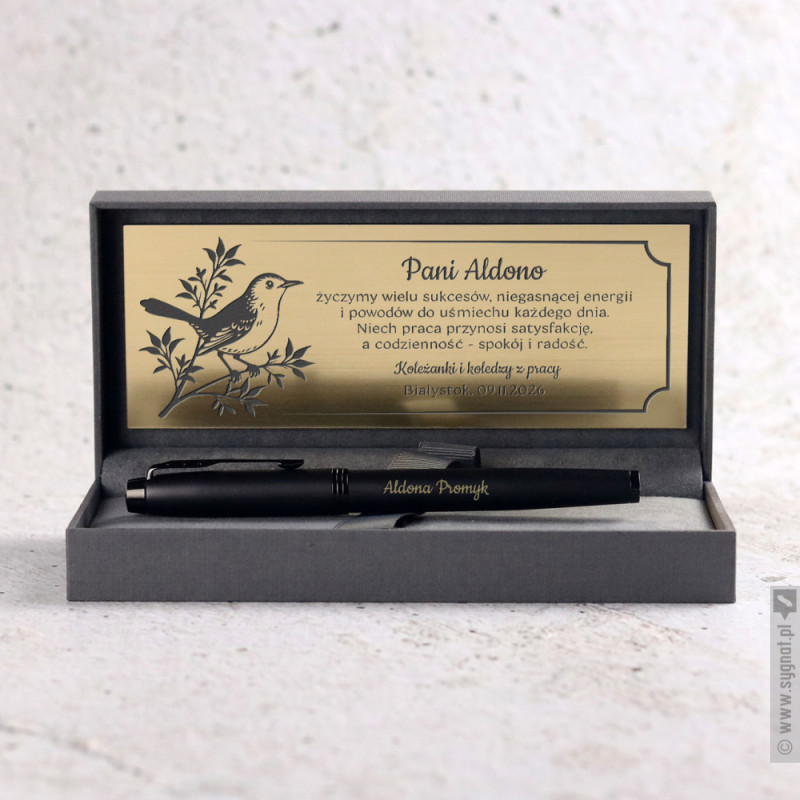 Grawerowany długopis Parker ze złotym wykończeniem w etui ze złotą tabliczką