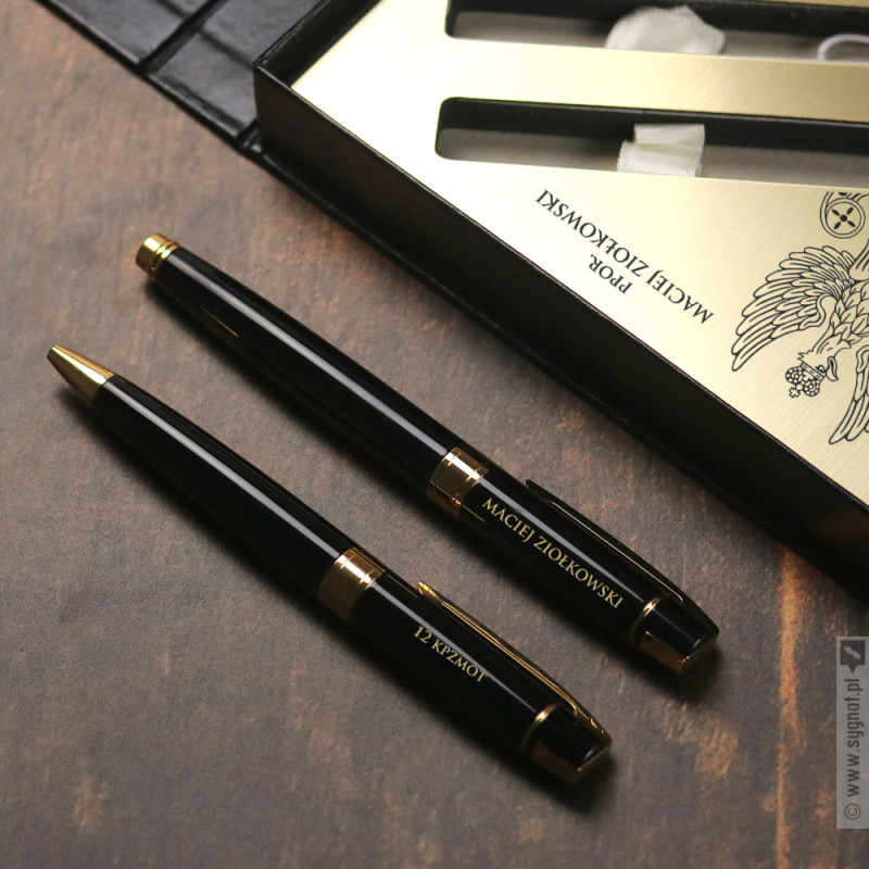 Grawerowany długopis Parker ze złotym wykończeniem w etui ze złotą tabliczką