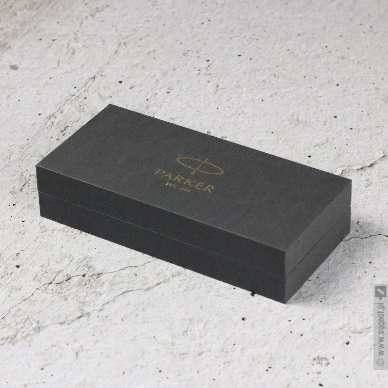 Grawerowany długopis Parker ze złotym wykończeniem w etui ze złotą tabliczką