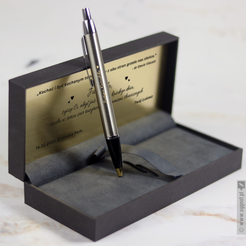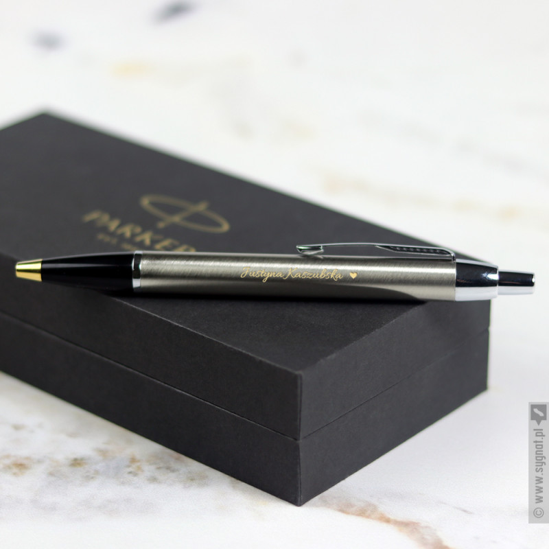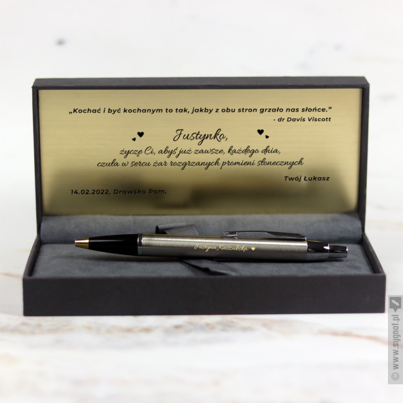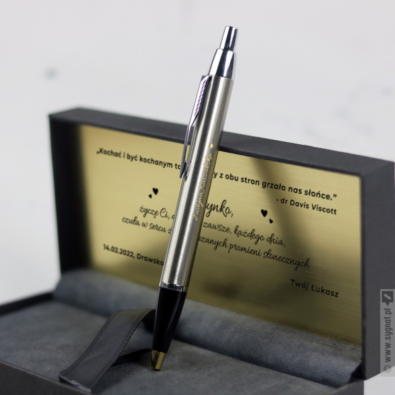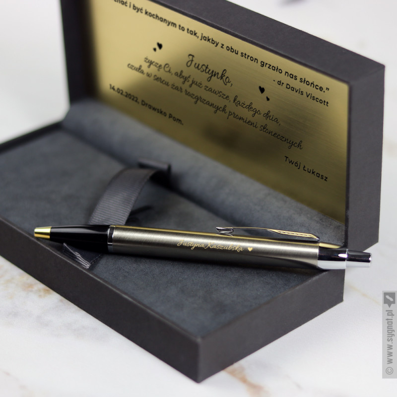 Grawerowany długopis Parker ze złotym wykończeniem w etui ze złotą tabliczką